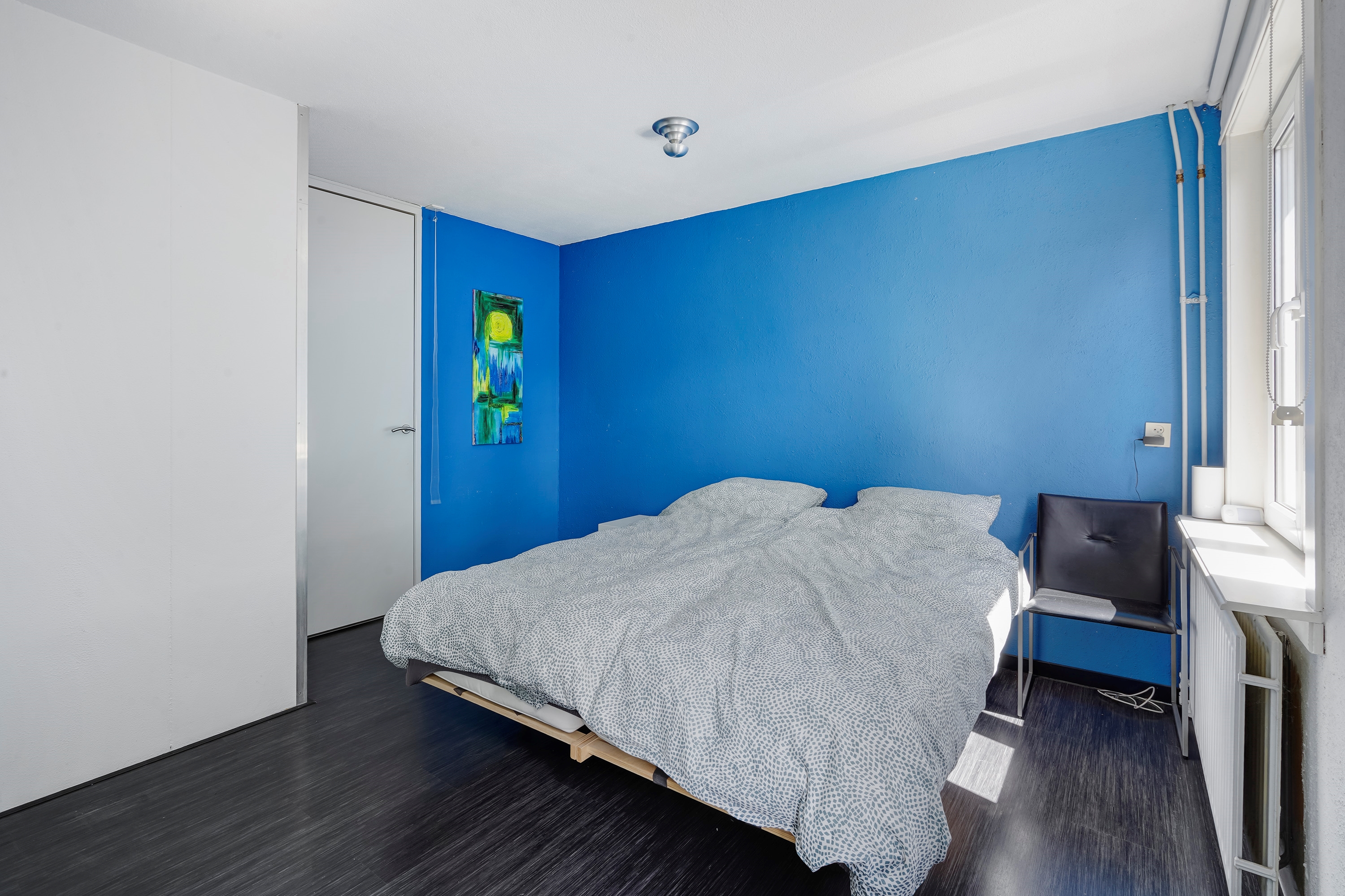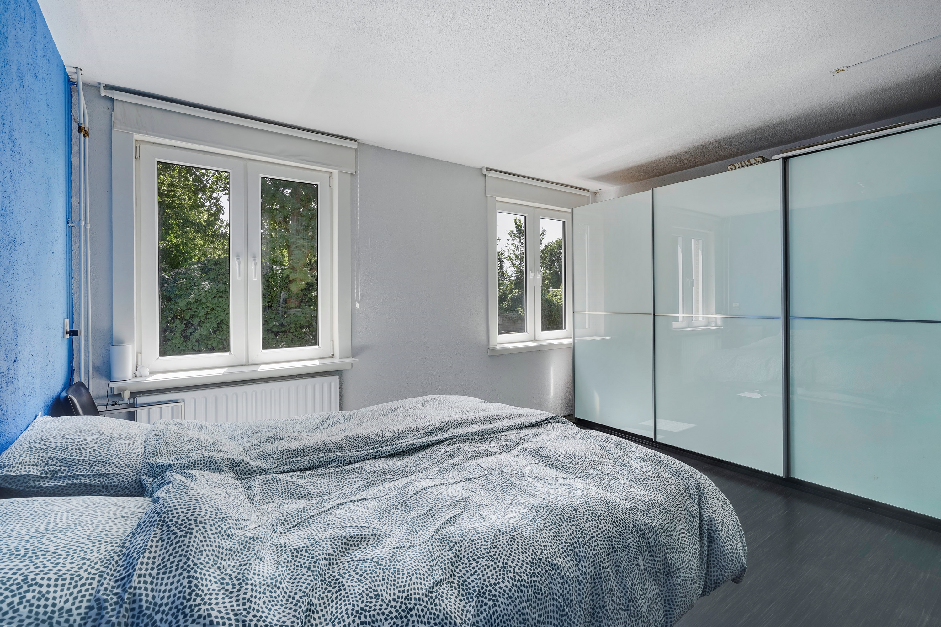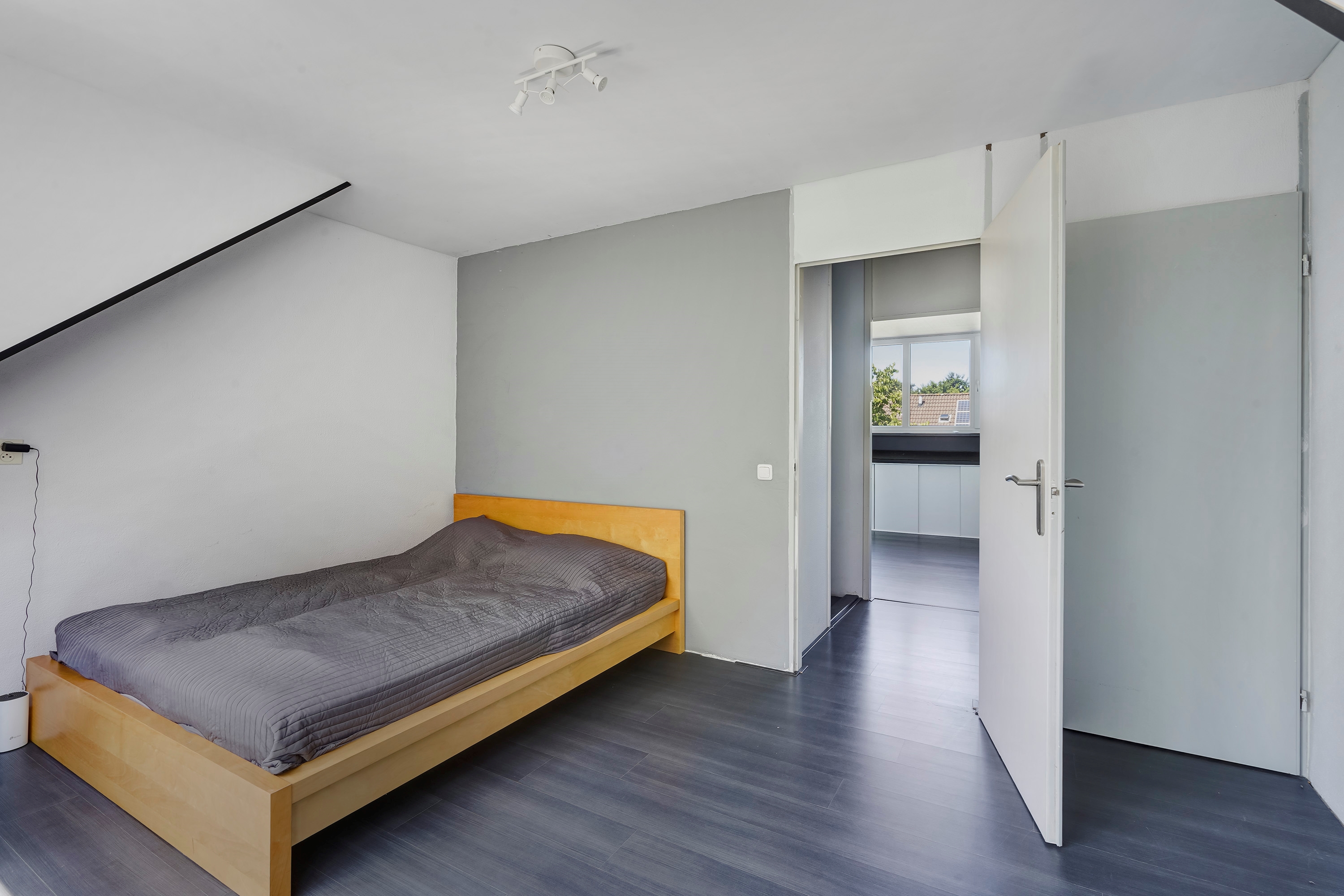 De eerste slaapkamer is gelegen aan de voorzijde van de woning en is over de gehele breedte van de woning, waardoor de slaapkamer zeer ruim is.