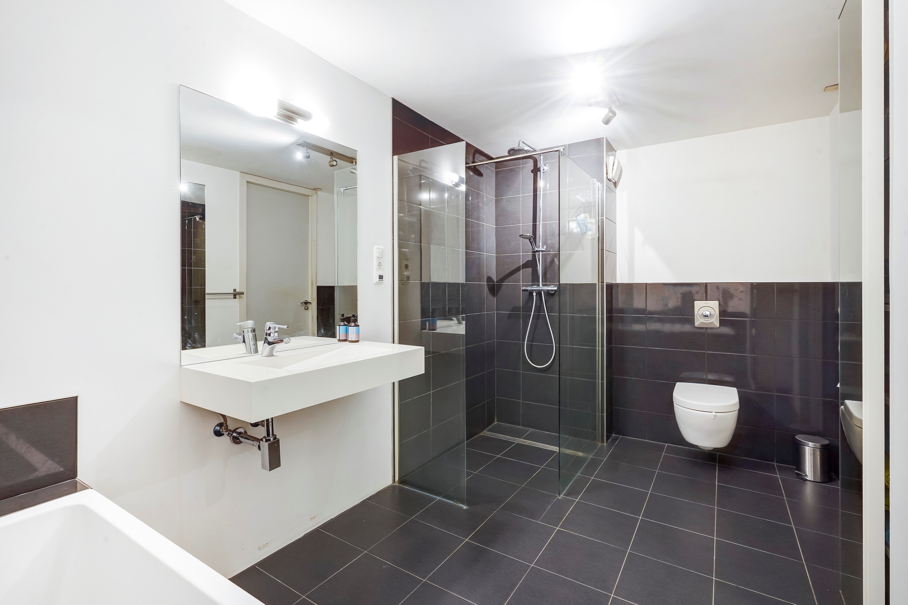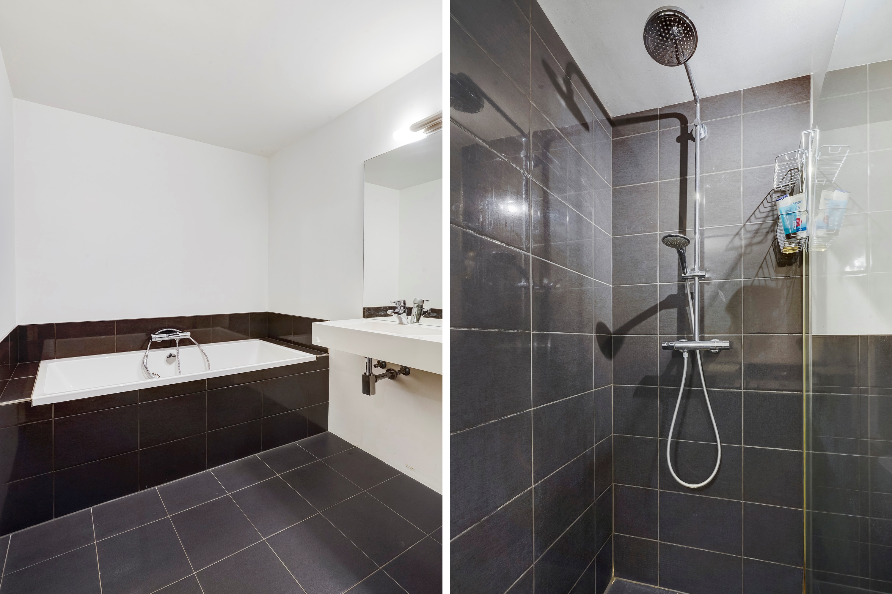Tussen de 2 slaapkamers is de badkamer gelegen, welke in 2015 is geïnstalleerd. De badkamer is ruim en voorzien van een bad, inloopdouche met hand- en regendouche, hangend toilet met inbouwreservoir, vloerverwarming en wastafel met luxe kraan. Het plafond is gestukt, de wanden zijn deels gestukt en deels betegeld.