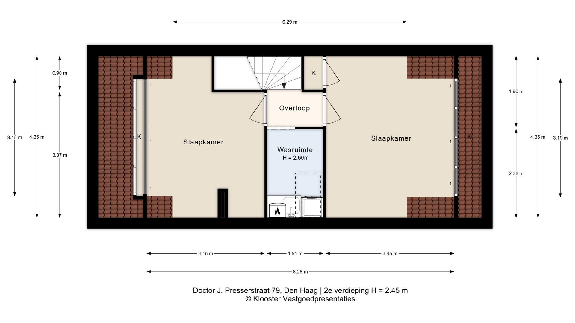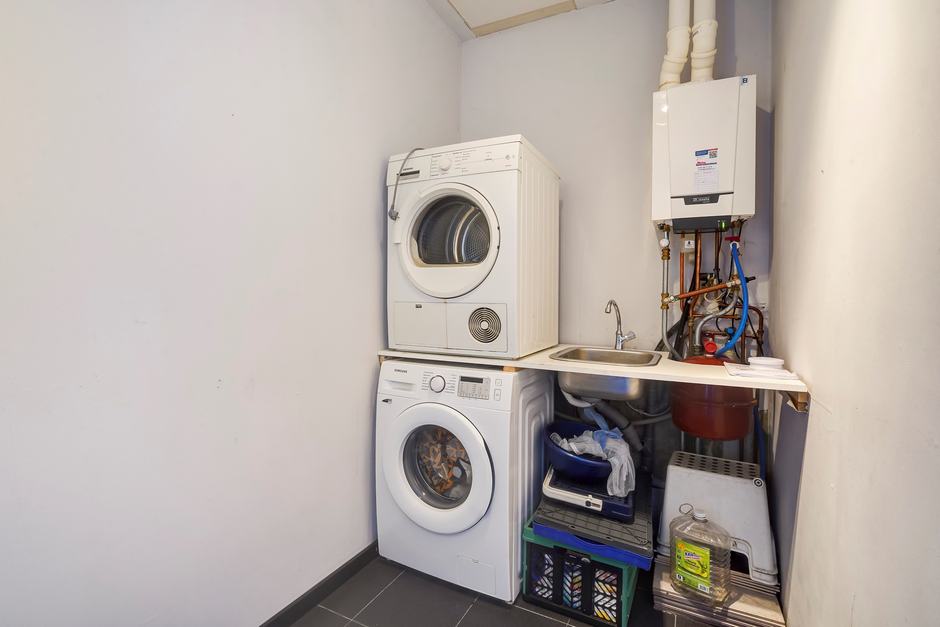 Tussen de slaapkamers is een wasruimte gecreëerd, alwaar ook de CV ketel is geplaatst. Via deze ruimte is de vliering bereikbaar middels een vlizotrap. Ook hier is veel ruimte voor het opbergen van spullen.