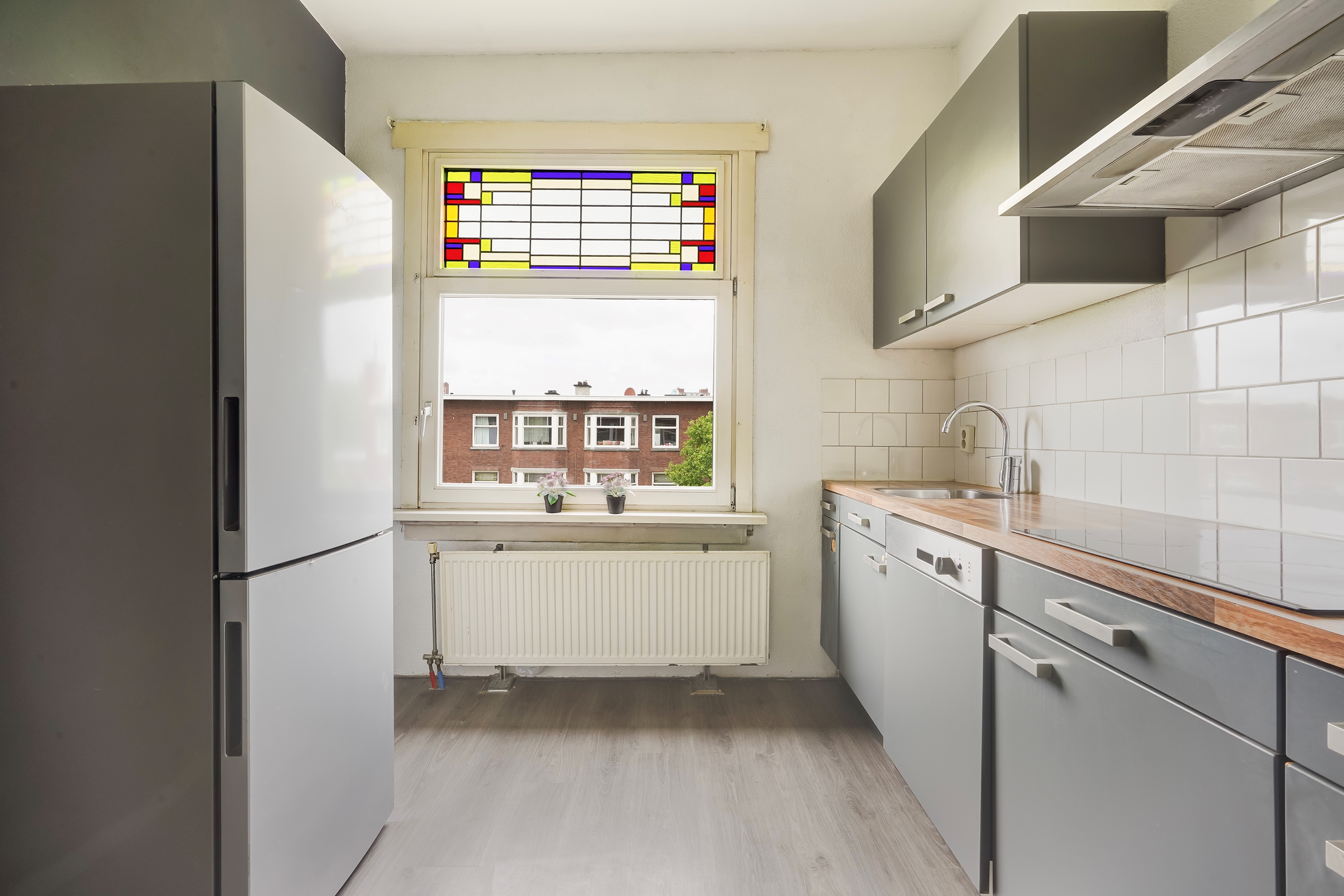 Welkom in Laakkwartier Op een steenworp afstand van het centrum, waar ooit de Haagse binnenhaven lag, ligt een diverse stadswijk met een no-nonsense karakter. De afgelopen jaren is deze wijk volop in ontwikkeling. Markante punten in de wijk zijn de Haagse Hogeschool en het ROC Mondriaan. Zij vormen het centrum van het groeiende studentenleven in Den Haag. Bijna de helft van de bewoners is tussen de 20 en 45 jaar. In de bevolkingssamenstelling zie je vele culturen terug, maar er is een opvallende kern van Nederlandse bewoners die soms al generaties lang hier wonen en sterk verknocht zijn aan deze wijk. In het gebied rond de oude Haagse binnenhaven (Laakhaven) zullen de komende jaren veel ontwikkelingen plaatsvinden met volop ruimte voor wonen, werken en ontspannen. Dit wordt een echte thuishaven voor pioniers, starters, studenten en wereldburgers. Er komen aantrekkelijke en zeer betaalbare woningen en ruimte voor particulieren om zelf een kavel te bebouwen. De Goeverneurlaan is de centrale as van de wijk. Hier vind je winkels, supermarkten en horeca in een omgeving die gebouwd is volgens de architectuur van Berlage. Op de fiets ben je in no-time in de binnenstad. Voor ontspanning kun je terecht in het Hof van Heden, een fraaie stadstuin, of je stapt op de fiets naar een van de oude parken in Rijswijk. Heb je groene vingers, maar zelf geen tuin dan kun je een volkstuintje huren aan het Hildebrandplein. Wij hebben heel veel moeite gedaan om een zo goed mogelijk beeld van deze geweldige woning te geven. Niet alleen hebben we een zeer uitgebreide fotoreportage van de woning met plattegronden, maar ook een uitgebreide video om alvast een goed (visueel) voorproefje te krijgen! Twijfel dus niet en kom langs! Wat maakt deze woning bijzonder? Deze bovenwoning ligt in aan de centrale ''laan'': kom binnen op de top etage