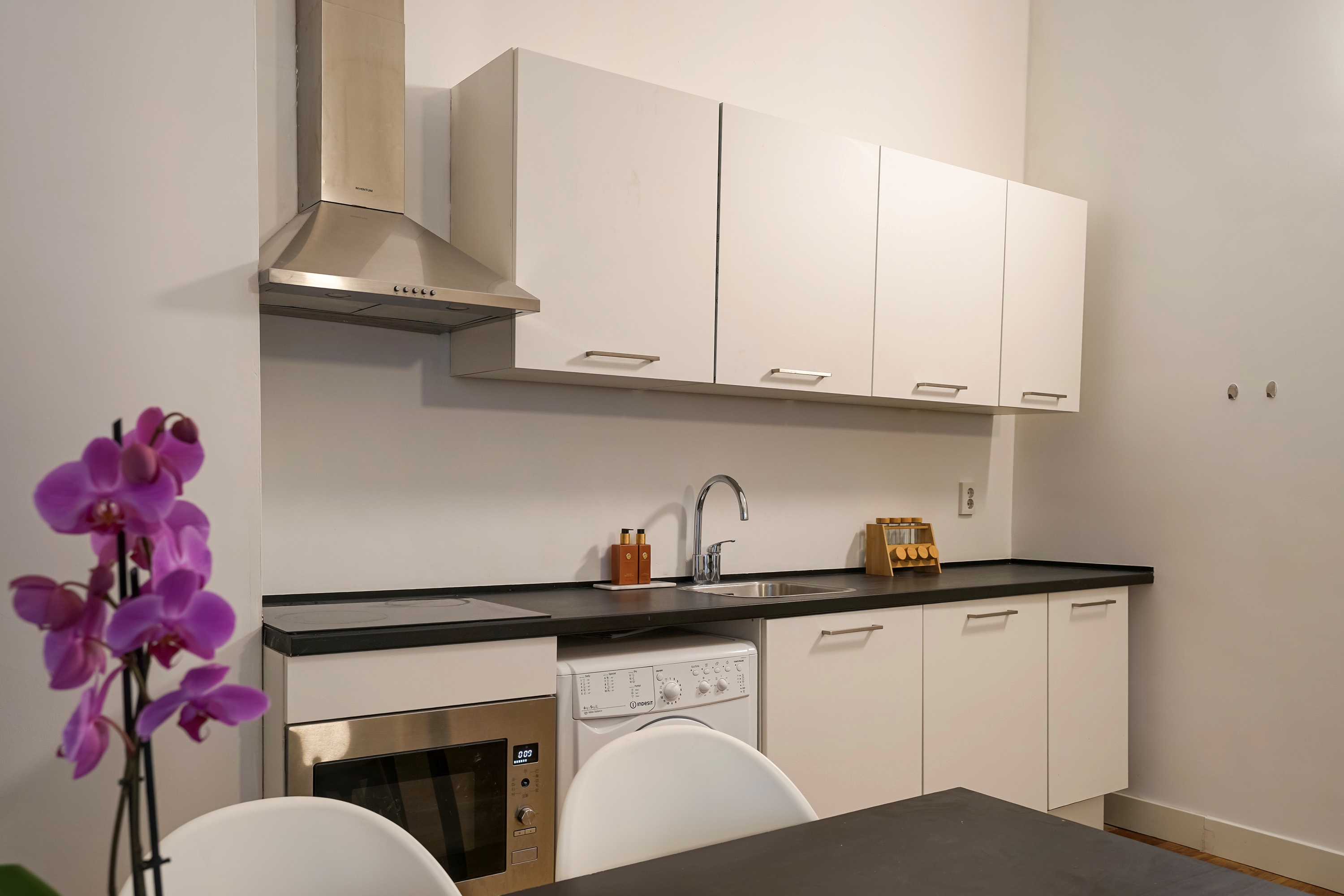 De open keuken grenst aan de woonkamer en biedt voldoende ruimte om een eetkamer te creëren. De keuken is 2 jaar geleden geplaatst en voorzien van een inductiekookplaat, afzuigkap, vaatwasser en koel-/vriescombinatie. De wasmachineaansluiting bevindt zich eveneens in de keuken.