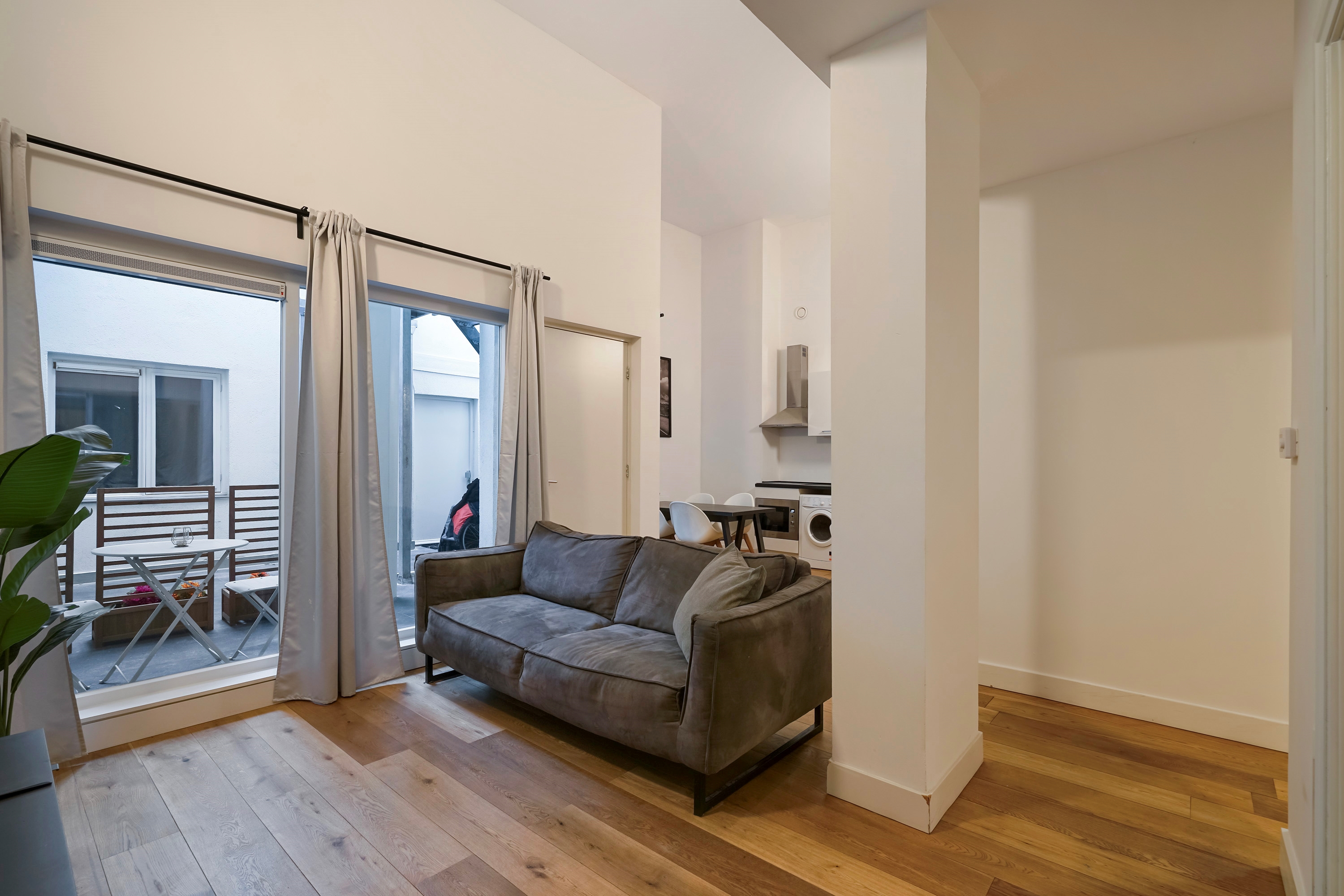 De entree van het gebouw geeft toegang tot de gang richting het achterhuis. Via de patio bereik je de voordeur van het appartement. Na binnenkomst betreed je de woon-/eetkamer.