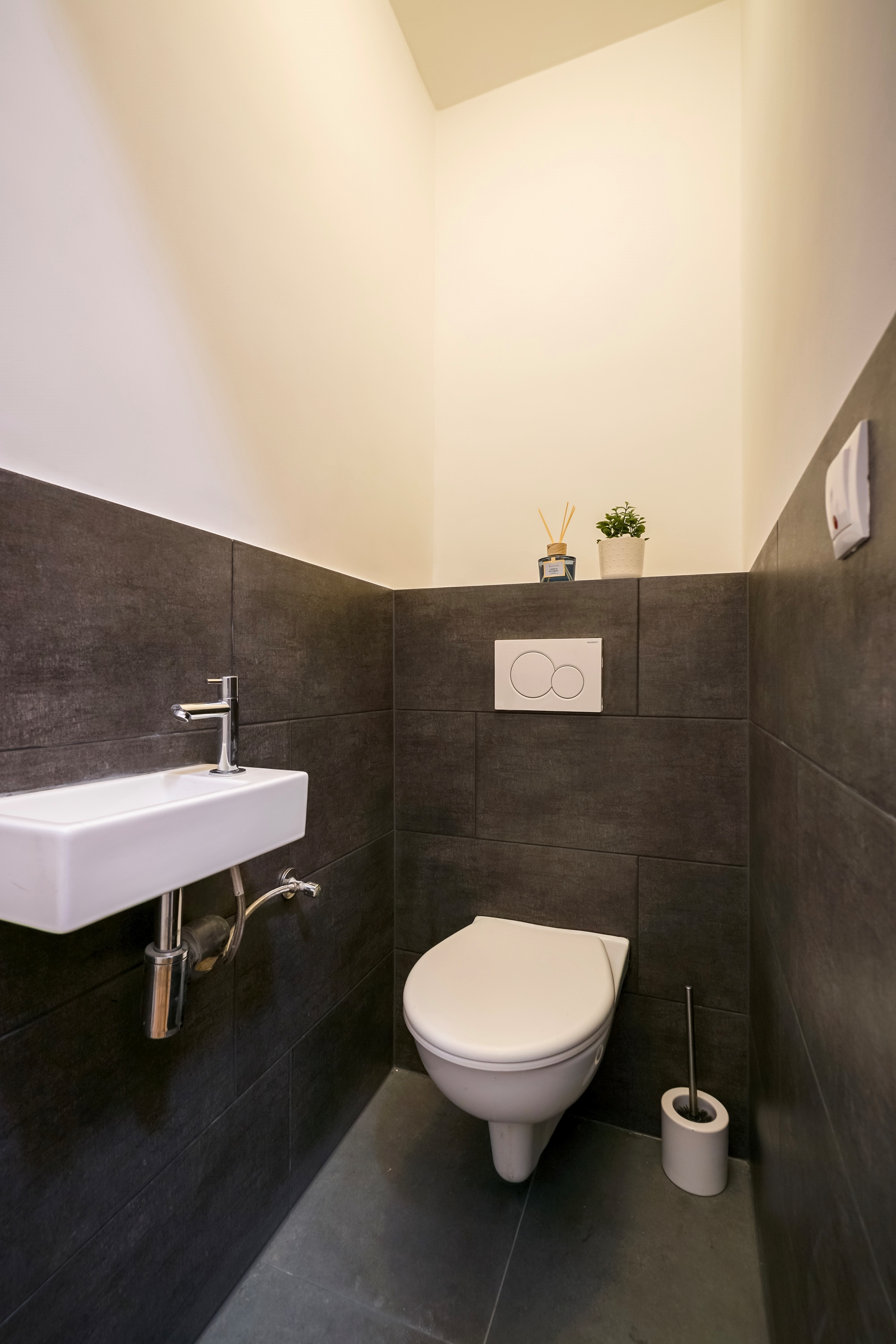 Via de gang naast de woonkamer bereik je de overige vertrekken. Aan weerszijden liggen twee slaapkamers, beide nagenoeg gelijk in formaat. Achterin de hal bevindt zich het separate toilet met fontein. Tegenover het toilet ligt de badkamer, voorzien van een douche met regendouche en handdouche en een wastafel.