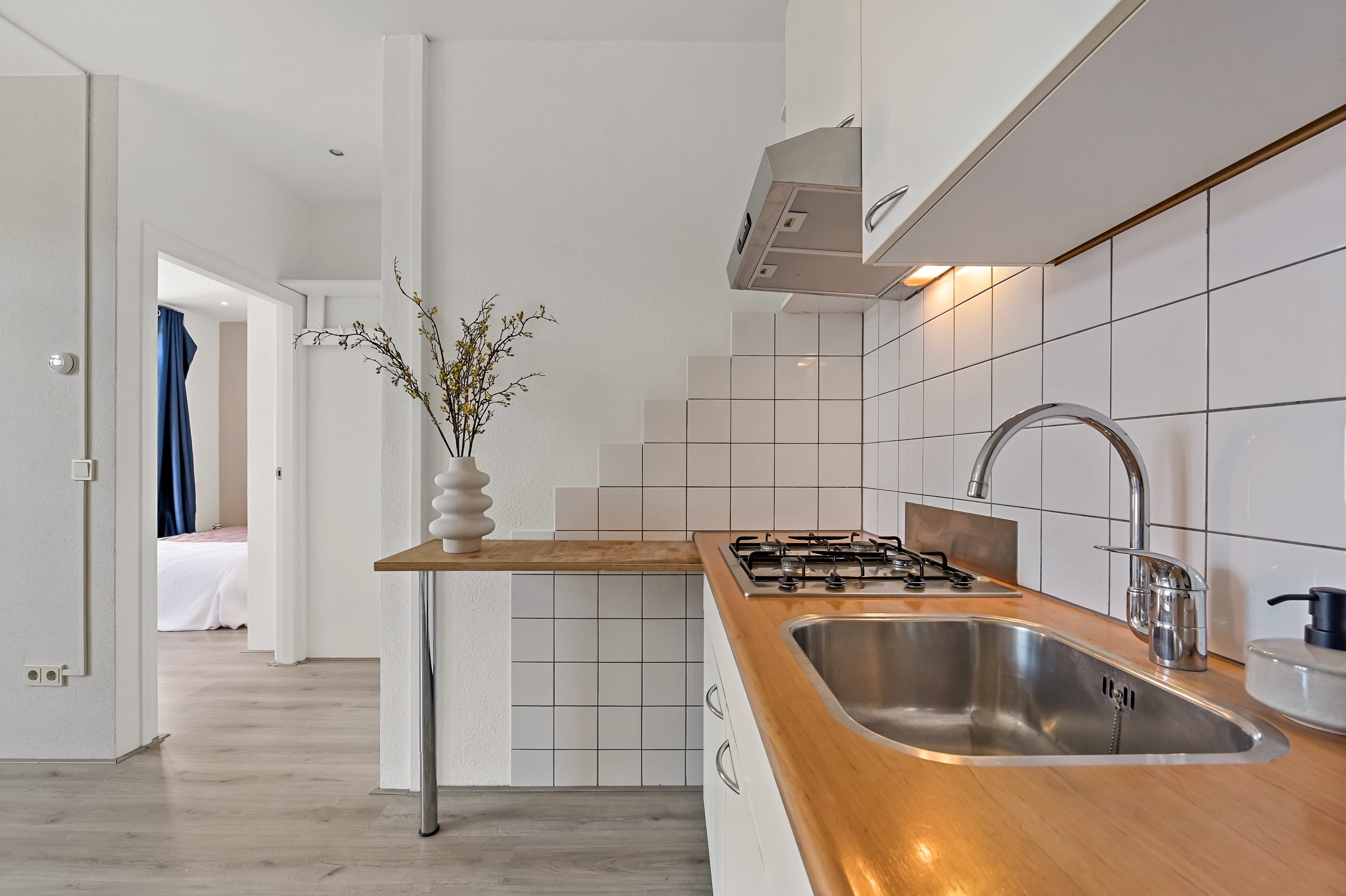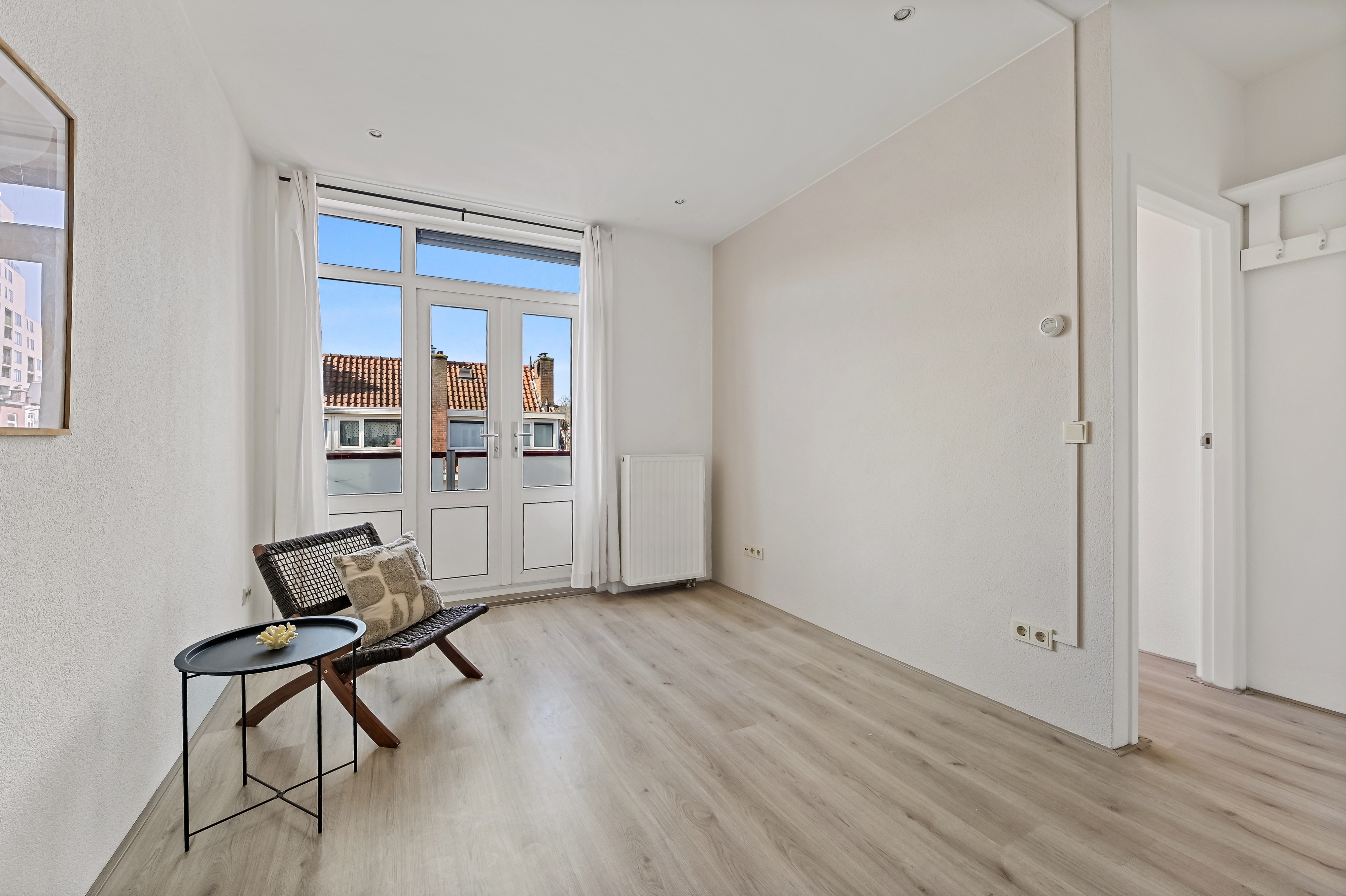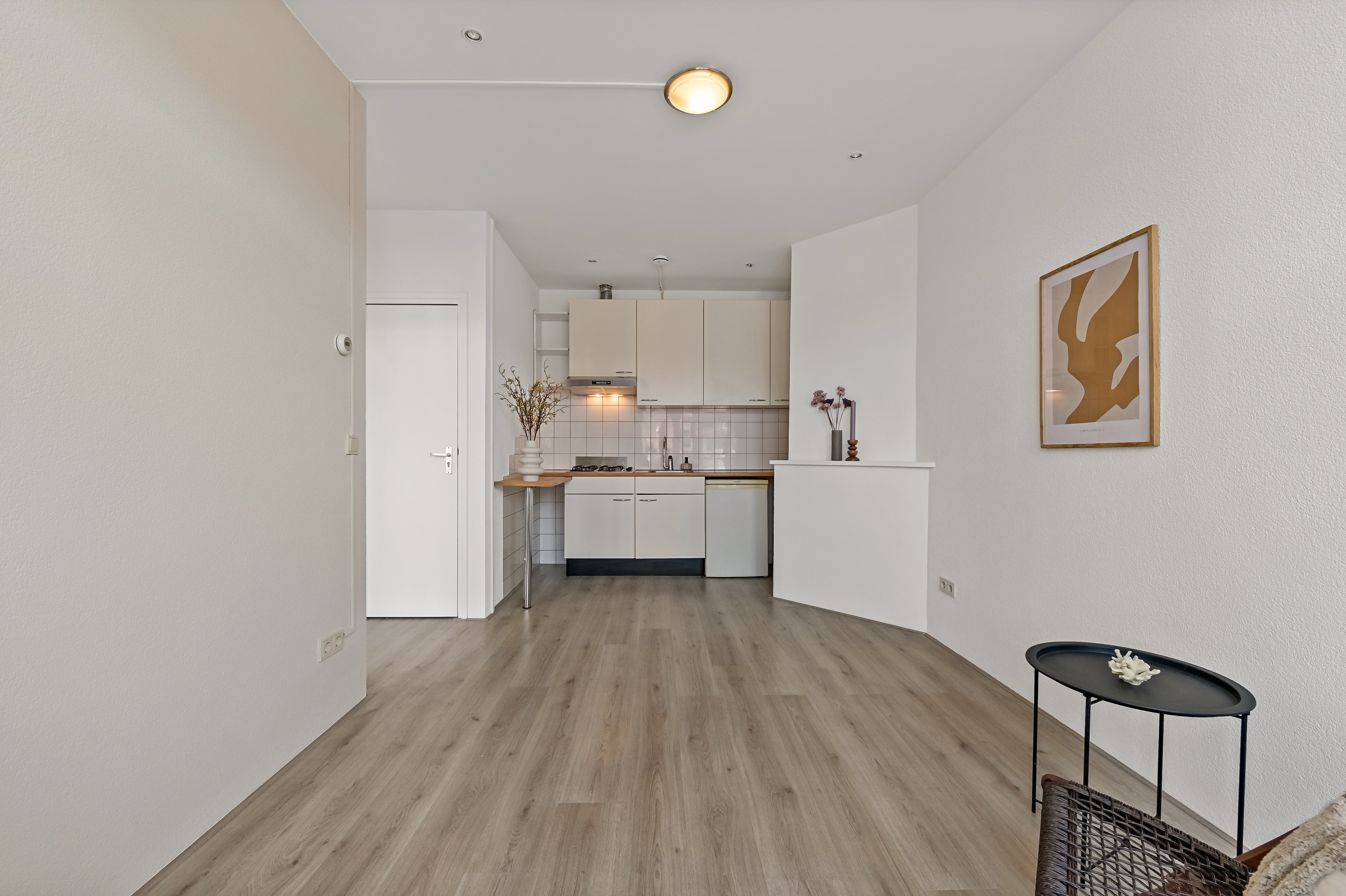 entree via een Haagse open portiek trap naar eerste verdieping, gemeenschappelijk toegangsdeur naar trappenhuis, toegangsdeur naar appartement op tweede etage, ruime woonkamer met open keuken, voorzien van 4-pits gasfornuis, afzuigkap, losse koelkast en spoelbak en vele keukenkasten.